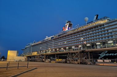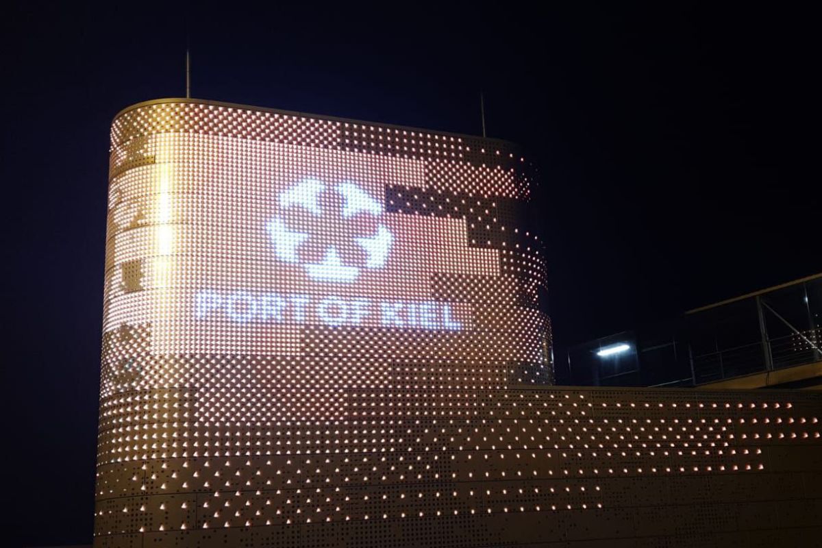 (Kiel, 9th December 2020) With darkness setting in on 9th December, Kiel’s Lord Mayor Dr Ulf Kämpfer and City Councillor Doris Grondke presented the LED wall at the new onshore power supply plant building at the Ostseekai Terminal together with the Managing Director at the PORT OF KIEL, Dr Dirk Claus, as well as the architects and lighting designers. Lord Mayor Dr Ulf Kämpfer: “Climate protection is one of our priority goals and I am pleased that we take another important step with the new onshore power supply plant. The PORT OF KIEL thus makes a major contribution to the realisation of our climate protection strategy – the 100 % Climate Protection Masterplan. The onshore power supply plant is an important milestone on the way to become the most ecological port in Europe.” The plant ranks among the most powerful ones of its kind and will supply the ferries of the Stena Line shipping company with eco-power in a first step. From next year onwards, two vessels can take eco-power at once, i.e. a cruise ship and a ferry. Dr Dirk Claus, Managing Director at the PORT OF KIEL: “With this façade we have literally created a little highlight in Kiel. As from January, we will cover 44 % of the energy demand by the vessels berthing in the port of Kiel in an emission-free and climate-neutral way. In two years, it is supposed to be 60 to 70 %. Through this, Kiel takes a leading role.” The onshore power supply plant’s value for the protection of the climate now becomes visually perceptible through the LED wall. It expresses the physical processes in a visual way.