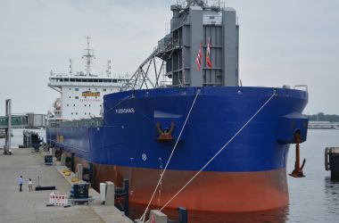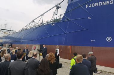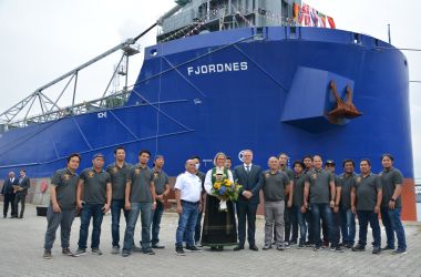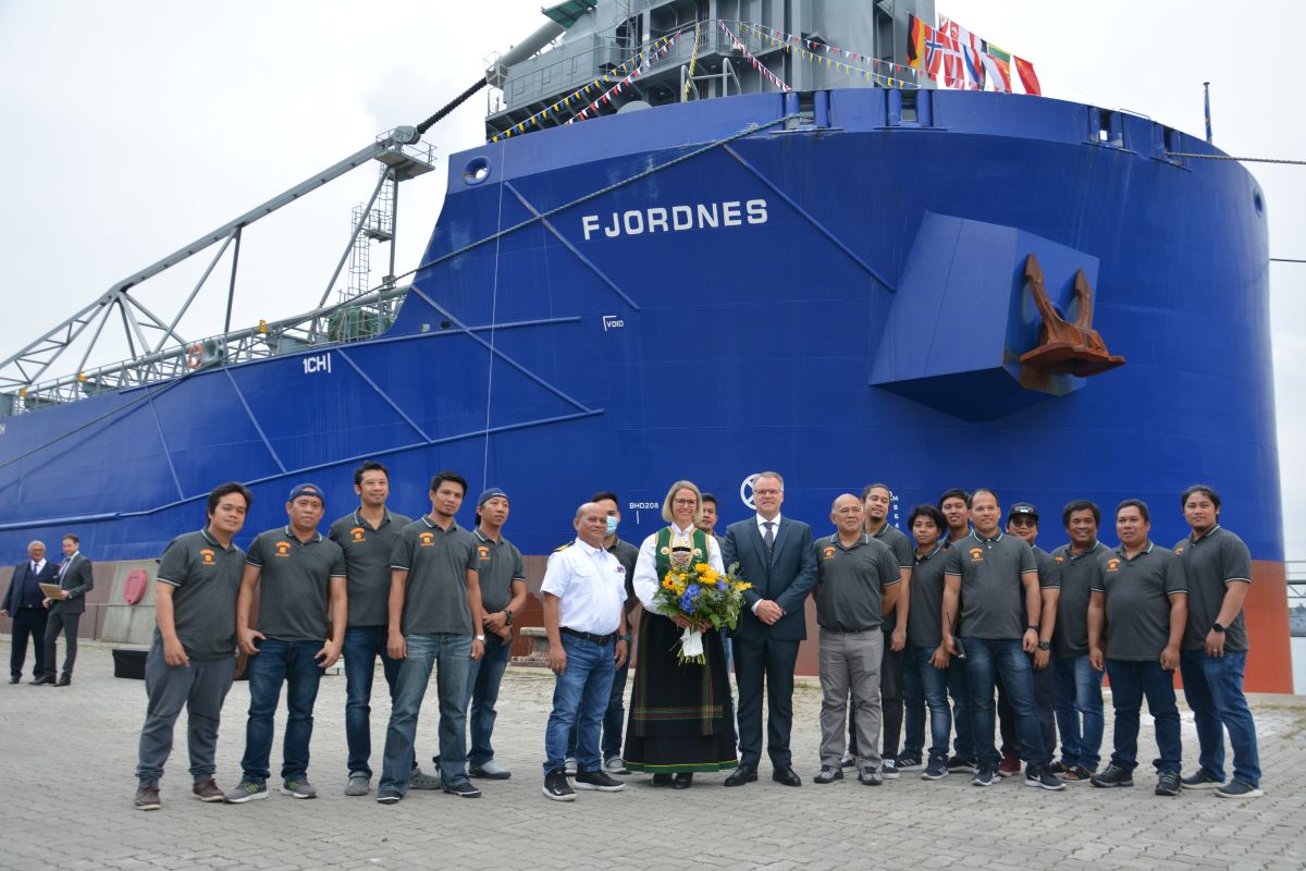 (Kiel, 6. September 2021) Schiffstaufe zur Kieler Woche. Am heutigen Montag (6.9.) in der diesjährigen Kieler Woche wurde am Ostseekai der neue Schwerlast-Schüttgutfrachter „Fjordnes“ von Frau Hilde Midtkandal Sandvik feierlich getauft. Das 190 Meter lange mit einer Selbstentladeanlage ausgestattete Schiff ist für Mibau-Stema, einem der größten Lieferanten mineralischer Baustoffe in Nordeuropa, im Einsatz und hat eine Zuladefähigkeit von 40.700 tdw (tons dead weight). Die technische Betreuung des Schiffes liegt, wie bei der gesamten Mibau-Stema-Einsatzflotte, bei der Reederei HJH Shipmanagement mit Sitz in Cadenberge bei Cuxhaven. Von Mibau-Stema werden jährlich rund 600.000 Tonnen Split an der Nordmole in der Kieler Wik umgeschlagen. Das Gestein wird aus vier Steinbrüchen in Südnorwegen bezogen und via Kiel an Bauunternehmen und Asphaltmischwerke in Norddeutschland ausgeliefert.